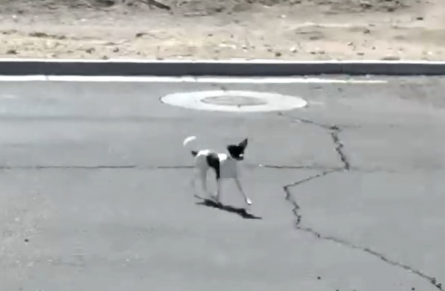 The dog, clearly shaken, immediately runs after the vehicle, desperate to return to the person who abandoned him.