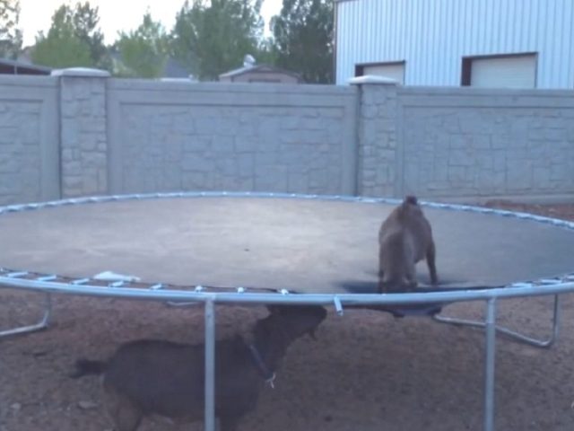 Even though the young goat seemed perfectly capable of handling himself on the trampoline, his attentive mother stayed close by, watching over him like any good parent would. She kept an eye on her adventurous baby, making sure he was safe while he explored his new favorite pastime.