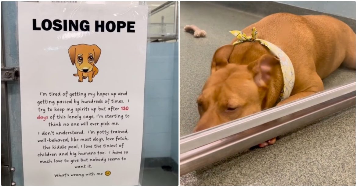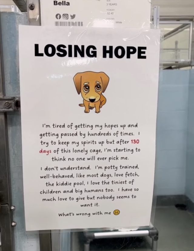 Recognizing Bella’s deepening depression, the shelter team knew something had to change. They decided to share her story in a new way—by creating a heartfelt sign to hang on her kennel door. It read: