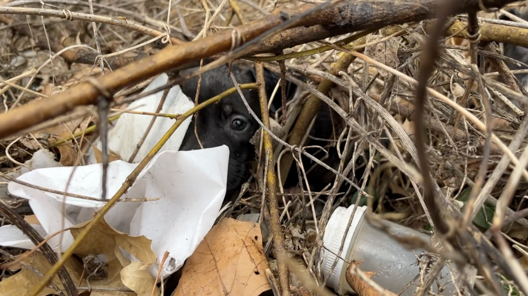 “Next to where the first four puppies were, there was an area of brush or weeds and some trash,” Lochmann said. “I started looking around in there, then, all of a sudden, I noticed a little black-and-white puppy pop his head up.”