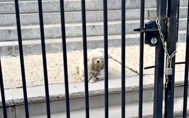 Behind the tall, wrought-iron fence of a quiet churchyard, a dog lay motionless, his matted fur tangled in filth, his eyes scanning the world beyond the bars. No one knew exactly how long he had been trapped there, but it was clear he had endured an unfair life. According to a witness, someone had tossed him over the unforgiving spikes that lined the perimeter, leaving him stranded in a place meant for peace, not pain. Yet, despite the harsh landing and abandonment, he was still alive—and still waiting.