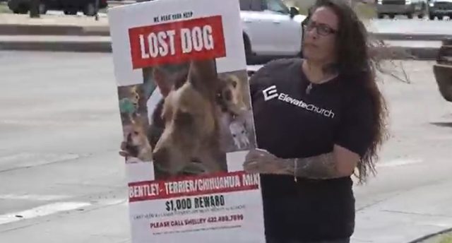 Sandra Ramos, a local resident of Midland, Texas, manns a lost dog sign at busy intersections. The dog named Bentley, a terrier/chihuahua mix, is listed as missing and there is a $1,000 prize for his safe return, according to the notice.