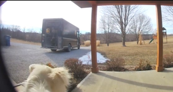 The UPS man places the box on the porch, and the Ring doorbell camera catches the dog in action. The large dog comes over and lifts his leg not once but twice to mark his territory!