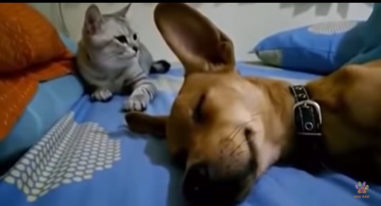 The scene begins innocently enough. The dog is curled up on the bed, deep in sleep, while the cat lounges comfortably beside him. It’s a picture of calm, the kind of serene moment that pet owners love to capture. The dog is completely at ease, lost in his dreams, with no idea that he’s about to become the unwitting star of a hilarious video.