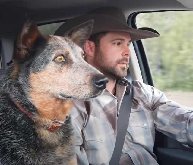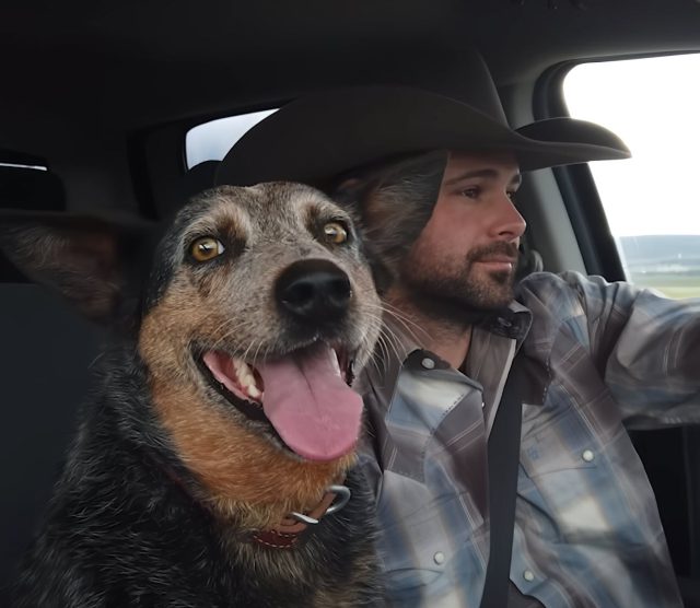 In a heartwarming video that’s been circulating online, we see a man named Chris Petersen cruising down the open road, his trusty dog right beside him in the passenger seat. Clad in a classic cowboy hat, Petersen keeps his eyes on the road while his loyal pup gazes out the front window, soaking in the passing scenery. The steady hum of country music plays softly in the background, setting the scene for this peaceful and joyful journey.