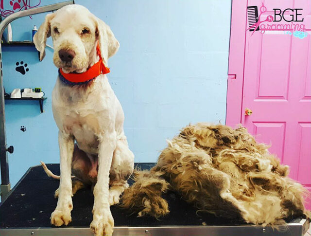 Kari rushed to her salon, BGE Grooming, in the middle of the night. “I knew it was bad, but nothing prepared me for what I saw. It smelled like death and the dog could not walk,” she said. Kari worked tirelessly till 3 in the morning. She fully shaved him and estimated that he had been carrying over two years of unchecked fur. She bathed him and took him to her local vet. Meanwhile, they decided to name him Lucky.