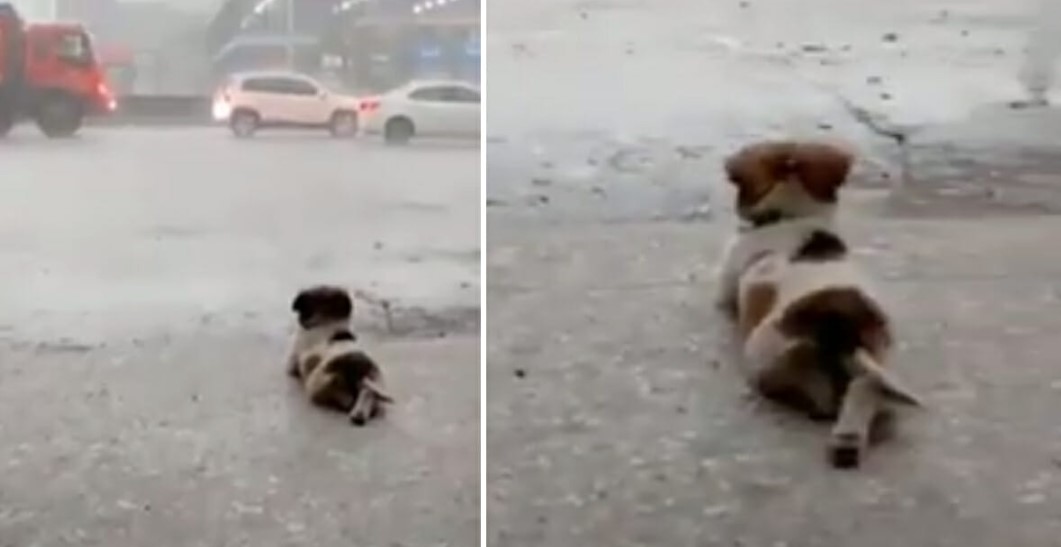 In an adorable viral video, the dog lays on his belly with his little legs crossed and just takes in the sight and the sound of the rain coming down on the highway.
