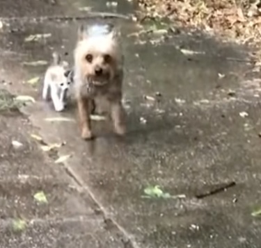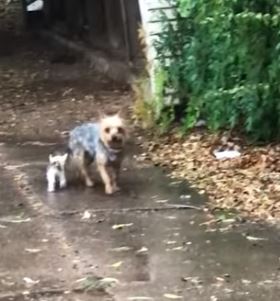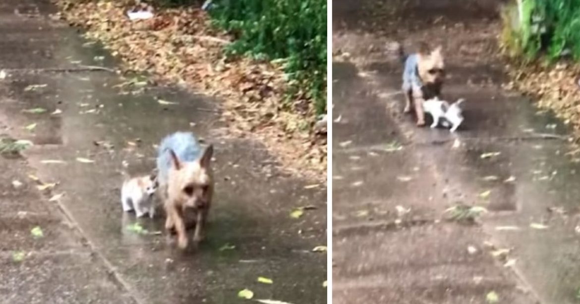 The compassionate pup had heard the faint cries of a tiny, helpless kitten left alone on the side of the road. The poor kitten was soaked from the rain, whimpering in distress with nowhere to go.