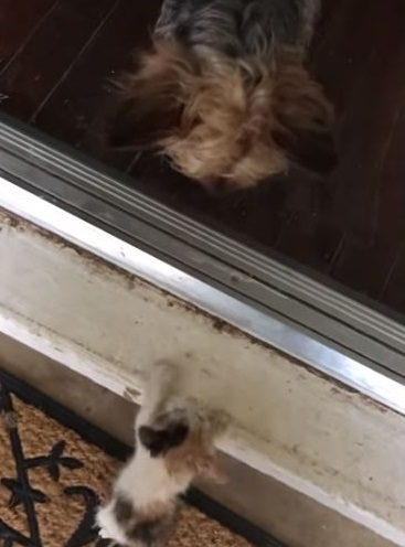 After what felt like forever, the drenched duo finally reached the front of the house. But there was one last obstacle—the doorstep was too high for the tiny kitten to climb.