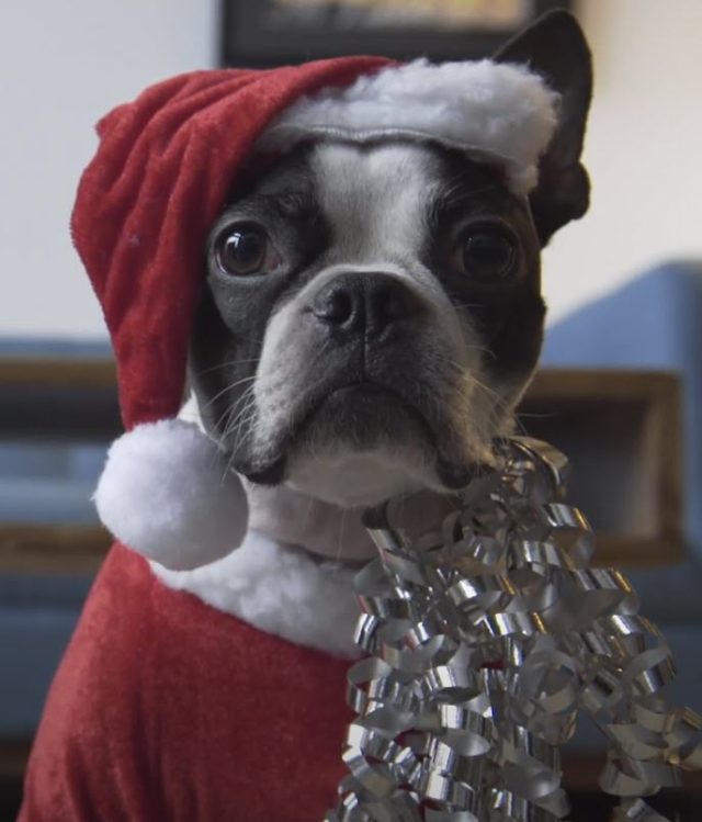 This adorable little Boston Terrier, named Five, is dressed up in a Santa outfit, dawning ribbons around his neck to imitate a beard.
