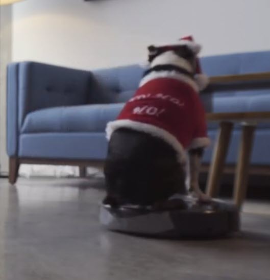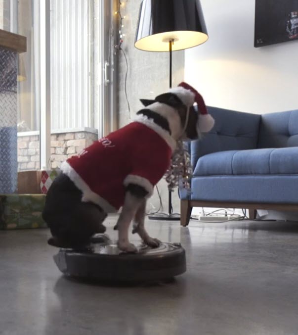 In all seriousness, the pup seems less than thrilled as he sits atop the Roomba, riding around the room. But it sure does make for a hilarious video to help get everyone else in the Christmas spirit as well!