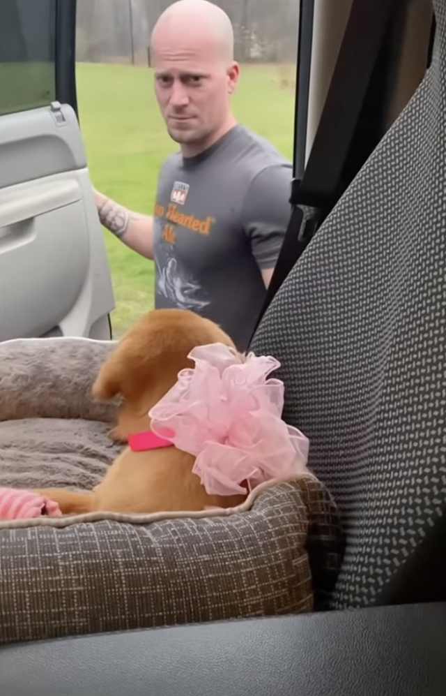 On the sly, she found the perfect puppy. The tiny dog already seemed like part of the family the moment they met. Wanting everything to be just right, she gently tied a pink ribbon around the pup’s neck, tucked her into the car, and drove toward what would become the little one’s forever home.