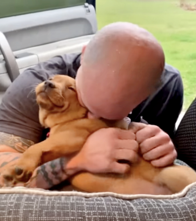 His reaction said it all. He stood beside her, unable to contain his happiness, and reached out to pull her into his arms. The connection was instant. The pup, sensing the warmth in his voice and the kindness in his touch, leaned into him without hesitation.