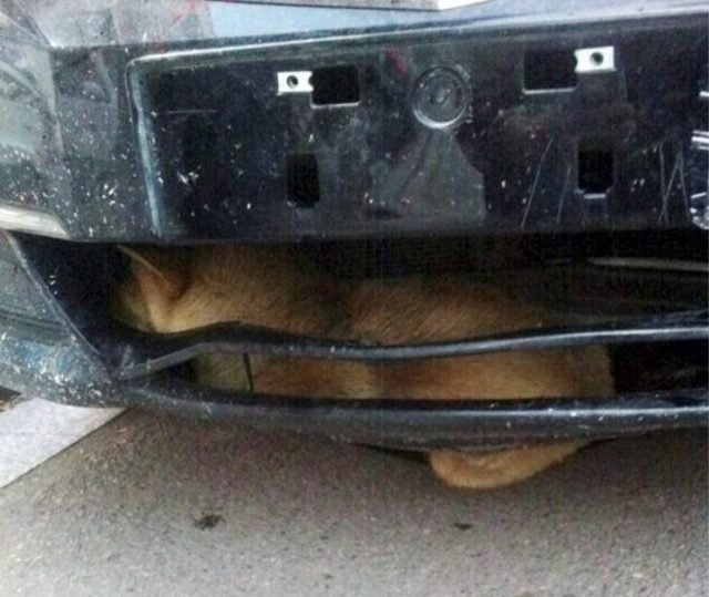 What he found left him stunned: a dog trapped inside the grill of his car.