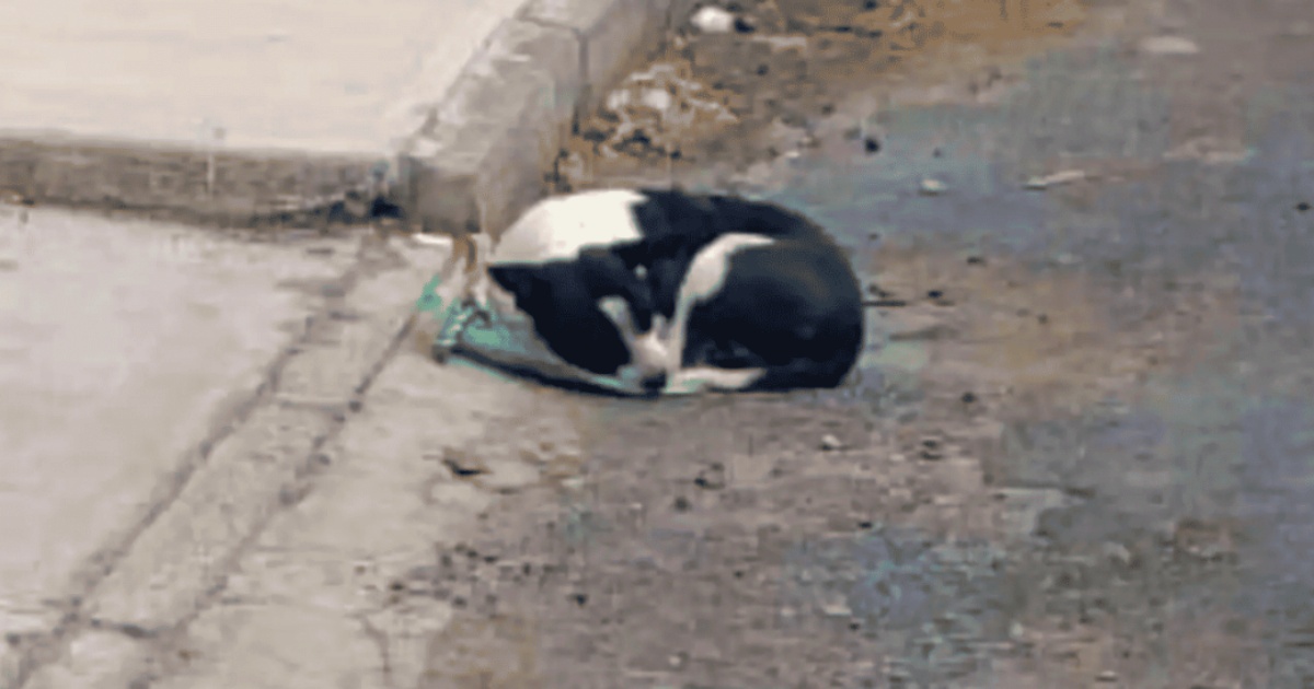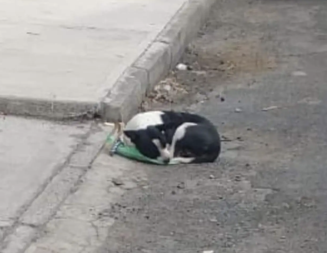 It was an ordinary workday when one man encountered something that stopped him in his tracks—a black-and-white dog lying quietly near the entrance of his workplace. She didn’t appear aggressive or distressed. Instead, she looked exhausted, emotionally drained, and heartbreakingly alone. But there was one detail that revealed her story without a single word: beside her sat a bag filled with toys.
