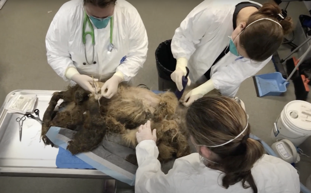 The NHS team wasted no time. They carefully began removing the heavy matting that had encased Ellie Mae for years. The process was long and delicate—five painstaking hours of trimming, untangling, and shaving away the weight of her past.