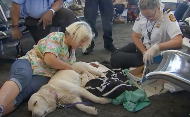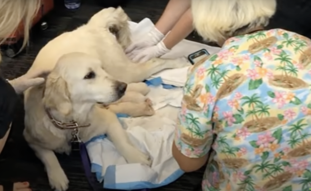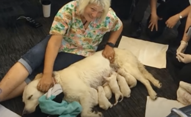 As Ellie began delivering her puppies, the atmosphere at Gate F80 changed completely. Instead of rushing through their pre-flight routines, travelers gathered in awe, watching as one puppy after another was born right there in the terminal. A passenger who had been present since the birth of the fifth puppy excitedly shared updates online, saying, “I was here since puppy five! It’s on Instagram; we’re getting a lot of likes!”