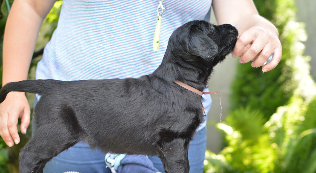 Flat-Coated Retriever puppies are active, curious, and eager to please. They are social dogs that enjoy being around people and other animals. However, they can be stubborn at times and require consistent and positive reinforcement to learn good behavior habits.