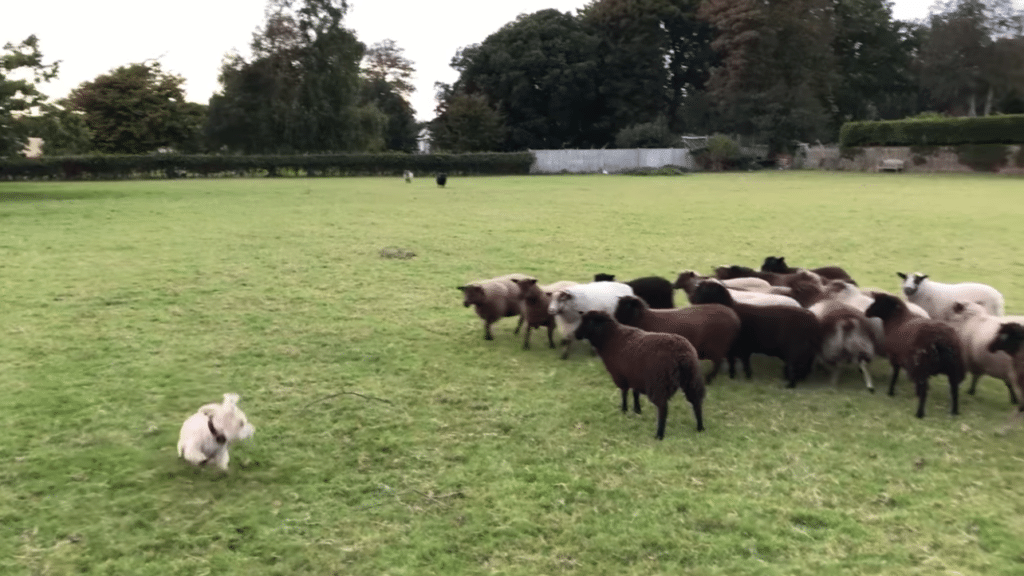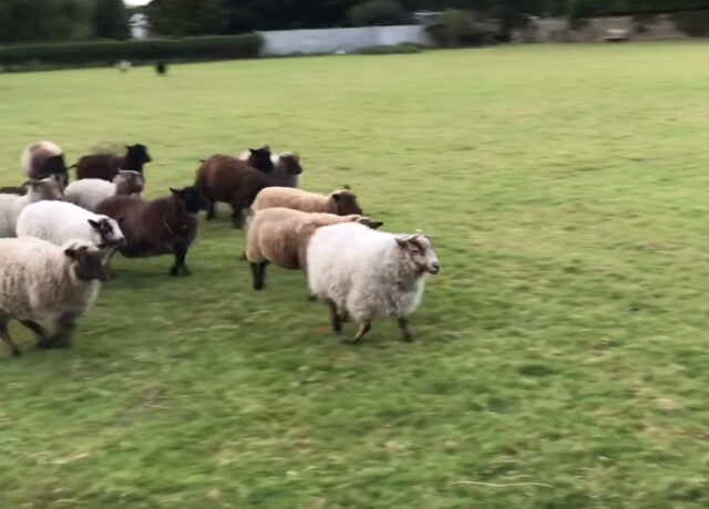 The “World’s Worst Sheepdog” playfully runs up to the herd before circling around them. This is when the sheep start chasing after the dog! Maybe Nelson isn’t slacking off and he’s just inventing a new style of sheepherding where the sheep chase their leader into the pen. Yeah, that’s probably it!