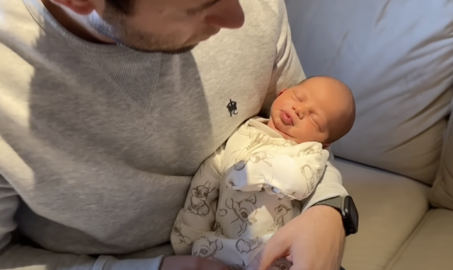 The baby, cradled in his father’s arms, waited quietly as Teddy padded into the room. With his nose twitching and eyes focused, Teddy approached carefully, drawn by the unfamiliar but intriguing scent. He didn’t rush. Instead, he took his time, sniffing the air and tilting his head as if puzzling over this strange, tiny creature.
