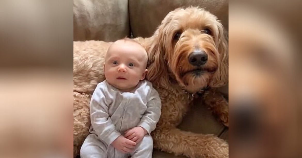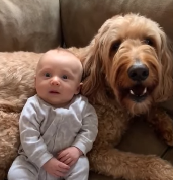 In this adorable moment, a Goldendoodle named Ralph E. Doodles lies calmly as his baby brother, Noah, rests against him. Instead of simply enjoying the moment, Ralph does something remarkable—he “talks” back when Mom expresses her love for him.