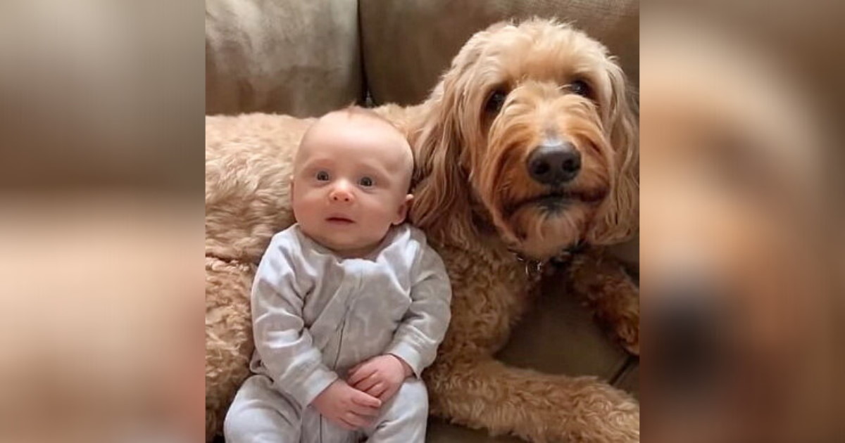 Goldendoodle “Tells” Baby How Much He Loves Him