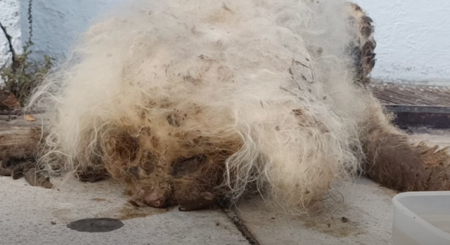 When rescuers found Julian, his appearance was shocking. His coat had become so overgrown and knotted that he could barely move. His body was buried under layers of dirt, insects, and waste. It was clear he had suffered for a very long time.