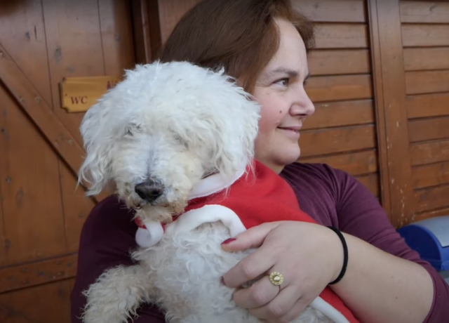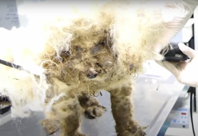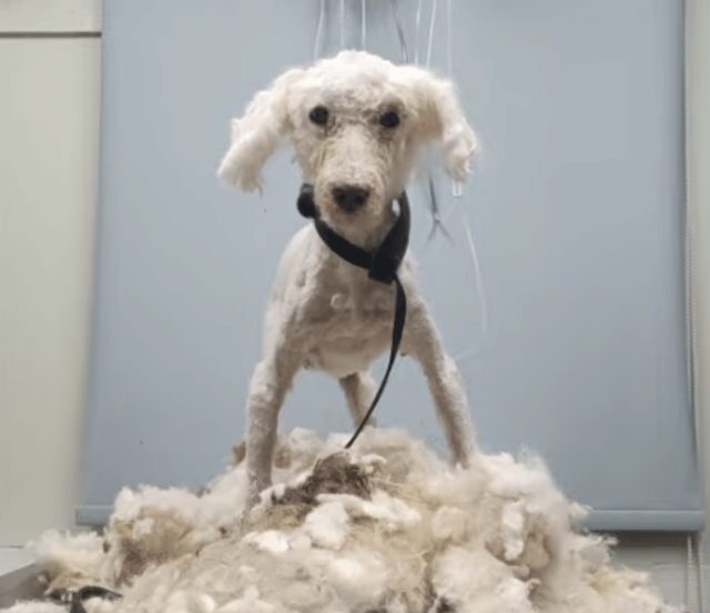The first step in Julian’s recovery was removing the massive clumps of hair that had imprisoned his small body. It took the rescue team four hours to carefully shave away years of neglect. As they worked, more and more of the dog beneath the coat began to appear—thin, delicate, and vulnerable but alive.
