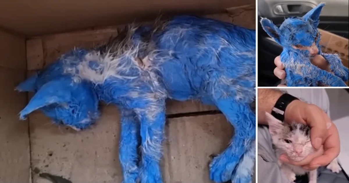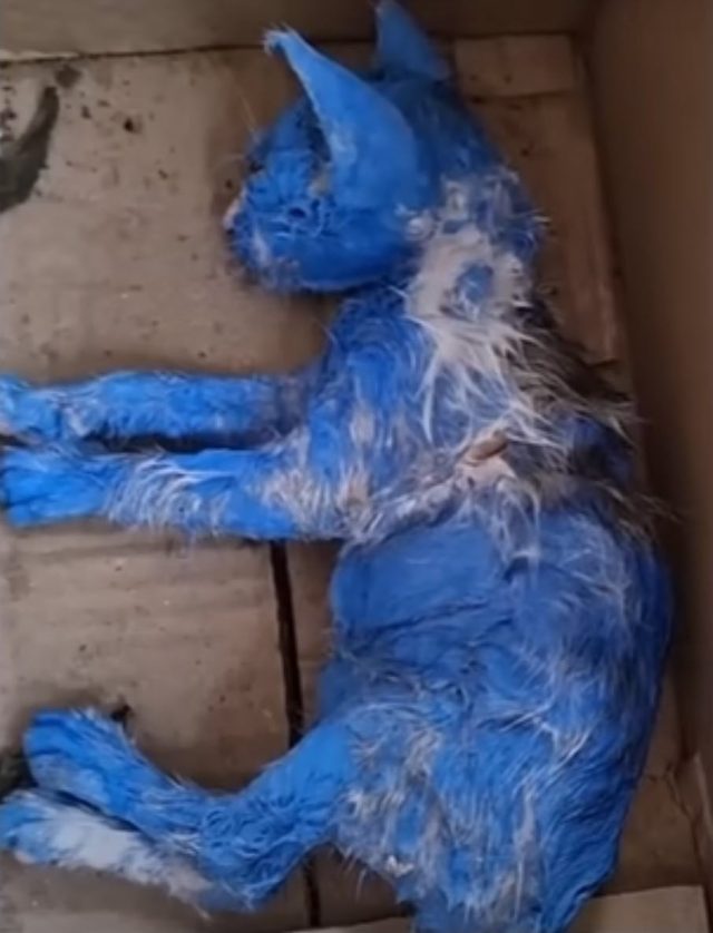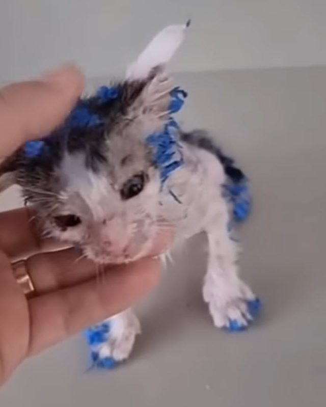 In the middle of a cold downpour, rescuers heard the faint sound of crying. What they found stopped them in their tracks—a tiny kitten, soaked and shaking, her fur caked in hardened blue paint. Someone had used her like a toy, painted her for fun, and tossed her away without a second thought. She was cold, in pain, and completely alone. That kitten would come to be known as Blue, a name born from her ordeal, but her story was only just beginning.