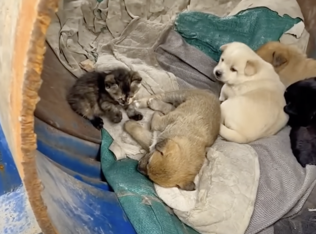 To Aunt Fu’s shock, a tiny kitten was nestled among the puppies, looking just as well-fed and cared for.