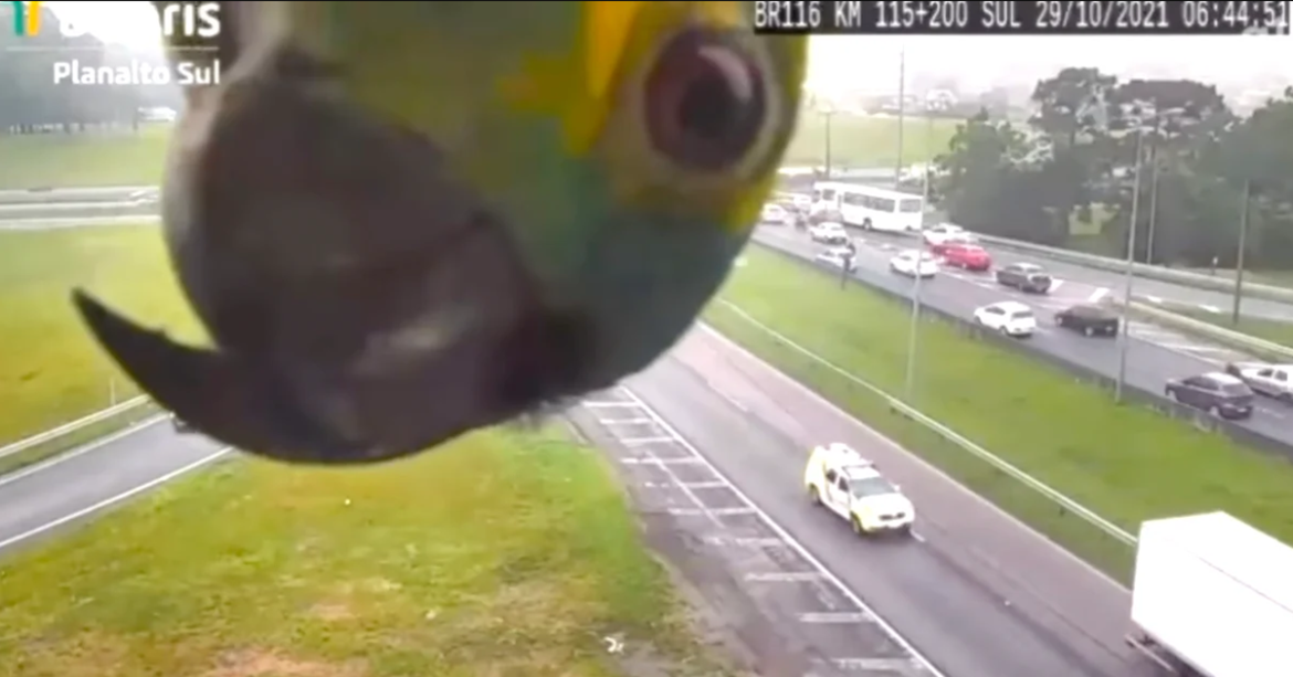 Traffic cameras are usually tasked with capturing a monotonous stream of cars and trucks as they make their way down busy highways. But one day in Brazil, a feed from a highway camera took an unexpected turn when an unusual visitor decided to make an appearance. Instead of the usual scenes of vehicles zooming by, the camera caught something far more captivating—a vibrant parrot, seemingly fascinated by the lens, stole the spotlight.