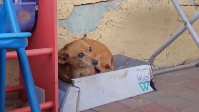 Seeing a defenseless animal abandoned is always heartbreaking, especially when they’re as vulnerable as this small Chihuahua mix. Her story is a powerful reminder of both human neglect and compassion. Left frightened and alone, the little dog had curled up in a shoebox outside someone’s home, trying to find shelter near the wall of a house. It became her makeshift refuge.