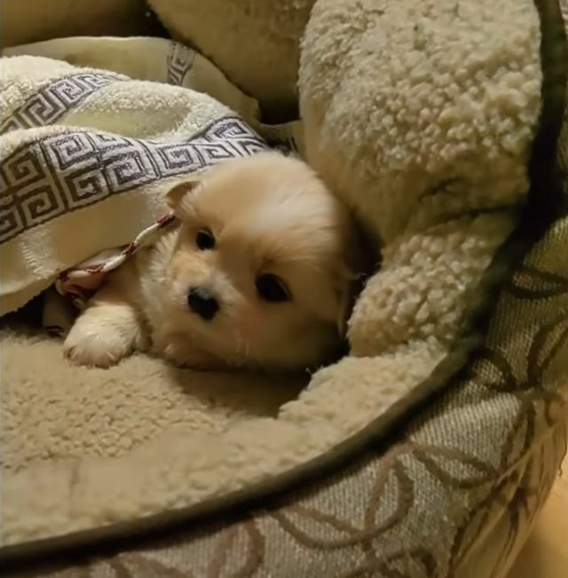 But he was still weak and hungry. His rescuer immediately bought a soft bed, a cozy blanket, and nutritious food—all the things this little pup had been cruelly denied.