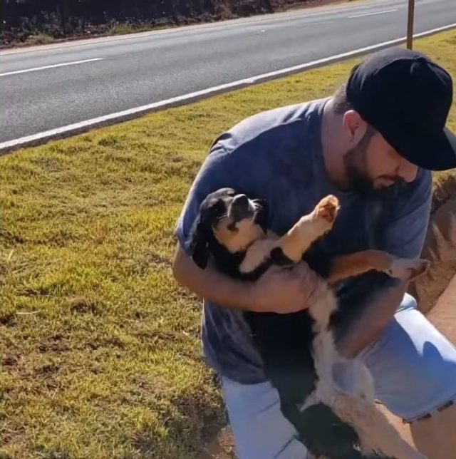 Finally, relief washed over him when he heard a vehicle screech to a halt nearby. His heart fluttered with joy as a man named Tom approached, ready to offer help. The pup’s eyes sparkled with gratitude as he looked up at the compassionate driver who was willing to take action.