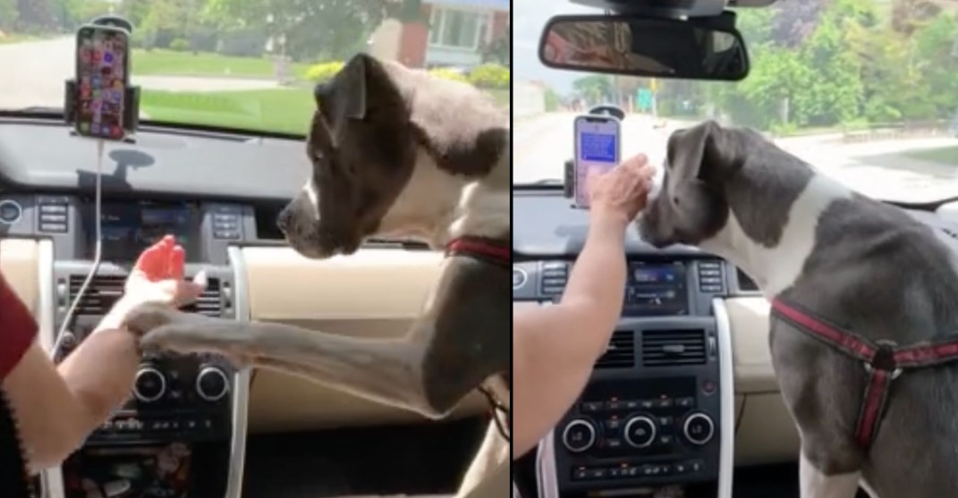 The safety-conscious pup pushes her hand away from the phone with her paw as a reminder to keep her eyes on the road.