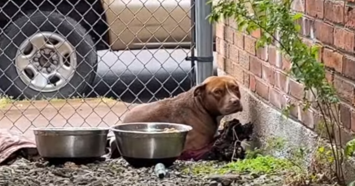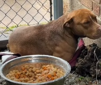 Though her calming words filled the air, the dog remained wary, too frightened to move from his spot. The woman understood that earning the dog’s trust wouldn’t happen instantly—it would require patience, kindness, and time. As she continued to speak, she noticed a small bowl of food and water nearby, indicating that someone had tried to care for the dog. But despite these efforts, the pup had been left alone to brave the cold, harsh rain.