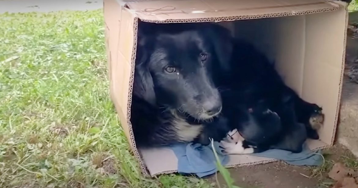 Stray Mama Dog Curls Up in a Box With Her Puppies to Keep Them Warm