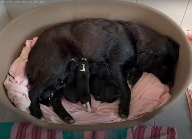 As soon as she was placed inside the bigger kennel, her puppies rushed to nurse, happy to be back with their mother.
