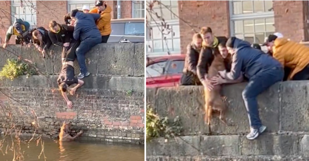 That was the case for a group of students who pulled off an impressive upside-down stunt to rescue a dog from a canal.