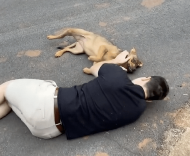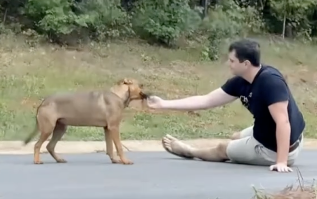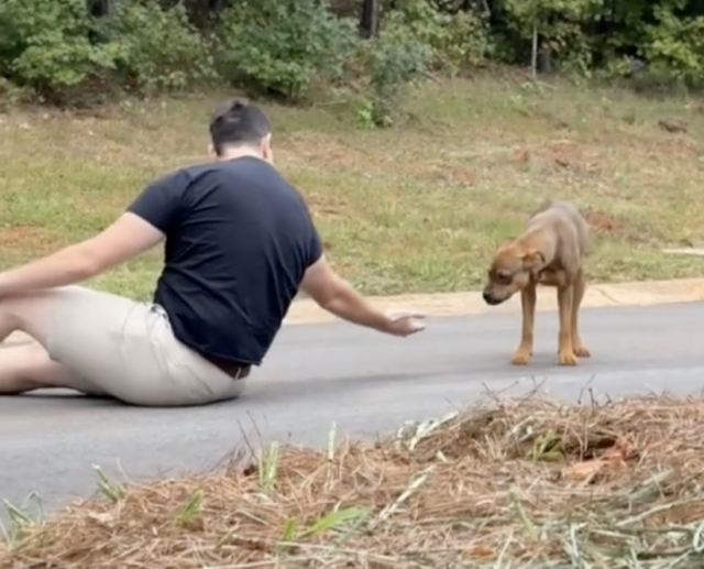 The pup, later named Tappie, lived on instinct and fear. Clay, moved by her fragile state, began making routine visits to the site, determined to help her find a safer life. He brought food and treats, always speaking softly, hoping to show her she didn’t need to be afraid. Day after day, he sat on the ground nearby, giving her space, trying to become a familiar presence rather than a threat.