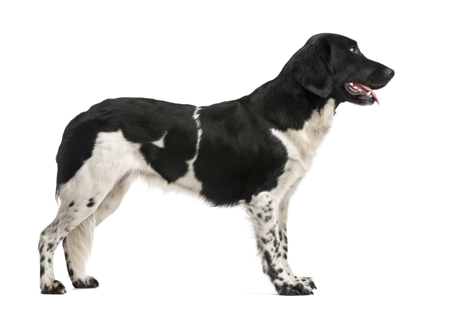 The Stabyhoun is a medium-sized sporting dog with a medium-length silky coat that typically comes in black and white or brown and white. They have long ears that hang down close to their cheeks, giving them an alert expression. They have a strong muzzle with a slightly curved nose, dark eyes, and a deep chest.