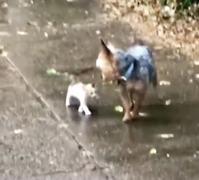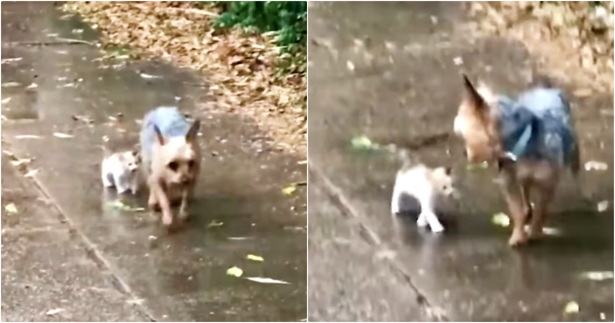 Recognizing her struggle, the Yorkie didn’t hesitate. He stopped, waited patiently, and made sure the kitten knew she wasn’t alone. He slowed down so she could keep pace, turning the simple walk into a gentle journey of companionship. His owner, touched by the quiet display of empathy, welcomed the kitten without question. It was clear she had found her place.