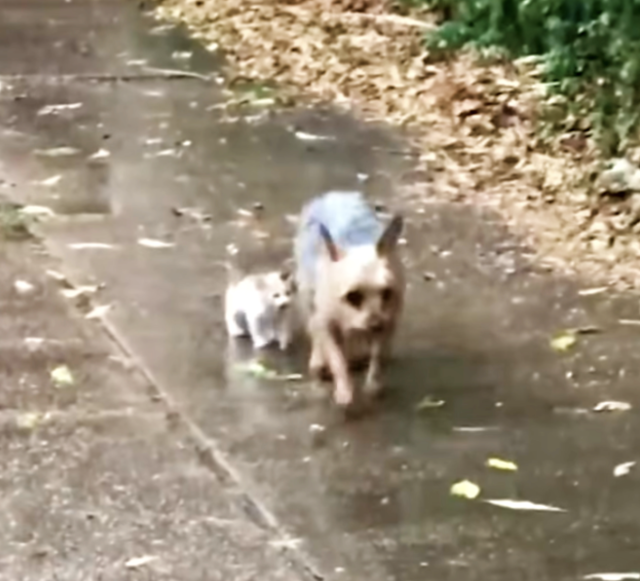 The Yorkie, rather than being startled, turned with curiosity and immediately took interest. Behind him was a petite Calico kitten, barely able to keep up as she padded through puddles, her fur slick with rain. She had no collar, no apparent home, and was clearly seeking shelter. She had chosen her companion well.
